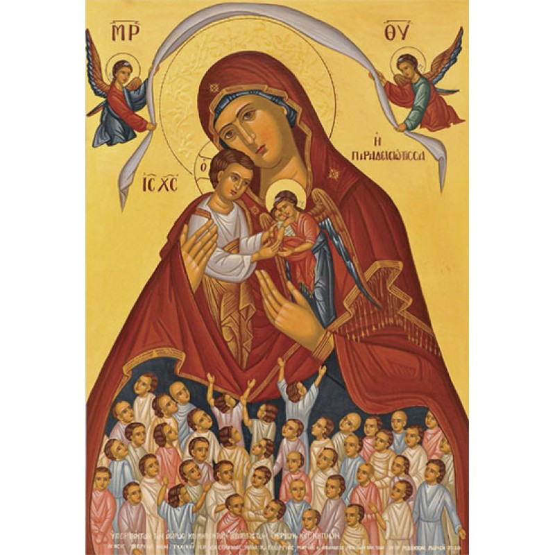 Η εικόνα αυτή προέκυψε με αφορμή τα ερείπια παλαιού ναού αφιερωμένου στην Παναγία Παραδεισιώτισσα στον Παχύαμμο της Πάφου στην Κύπρο. Κατά παράδοση στον τόπο εκείνο θάβονταν αβάπτιστα ή και βαπτισμένα παιδάκια τα οποία είχαν φύγει «αώρως» πρόωρα από αυτή τη ζωή. Όπως φαίνεται οι άνθρωποι προσέβλεπαν στο πρόσωπο της Παναγίας η οποία ελεεί τον κάθε πονεμένο άνθρωπο όπως μεσολαβήσει στον Υιό της να σώσει το παιδί τους το οποίο έφυγε πρόωρα. Μεγάλη ήταν η παράκληση όταν επρόκειτο το παιδί να ήταν και αβάπτιστο ελπίζοντας στο έλεος της Παναγίας και του Χριστού να μην χαθεί μιας και δεν έφταιγε σε τίποτα αυτό και να κερδίσει τον ποθητό παράδεισο.